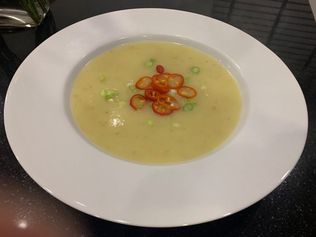 Leek and Potato Soup with spring onion and chilli garnish Full Recipe »